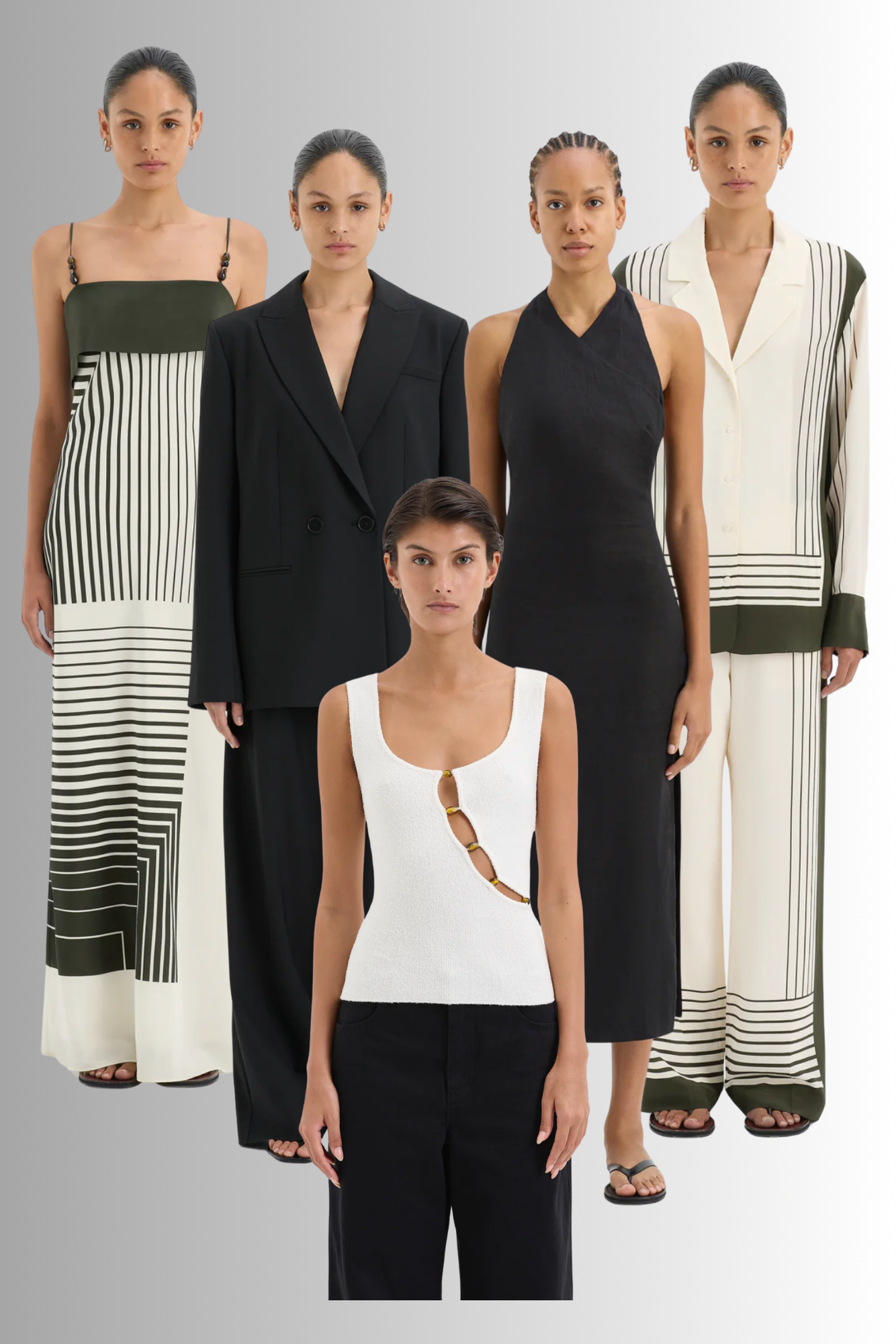 Leilana slip dress and trousers: similar patterning to the ever popular Toteme shirt/trousers set that has been copied up and down the high street, these pieces in a lightweight silk crepe de chine bring an effortless elegance to casual minimalism.
